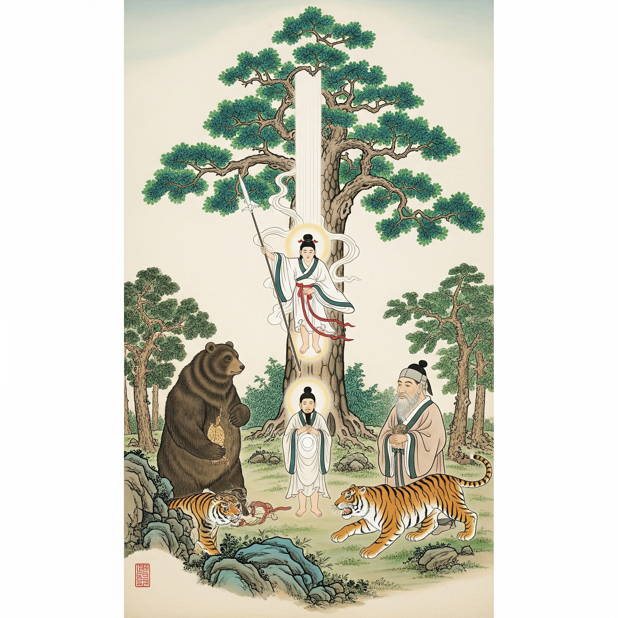 단군 신화의 가장 기본 서사는 『삼국유사』, 『제왕운기』 등 고려 후기 문헌에 처음 집대성되었습니다. 핵심 내용은 하늘 신 환인의 아들 환웅이 신단수 아래로 내려와 신시(神市)를 열고, 곰과 결합한 웅녀 사이에서 단군이 태어나 고조선을 세운다는 이야기입니다.